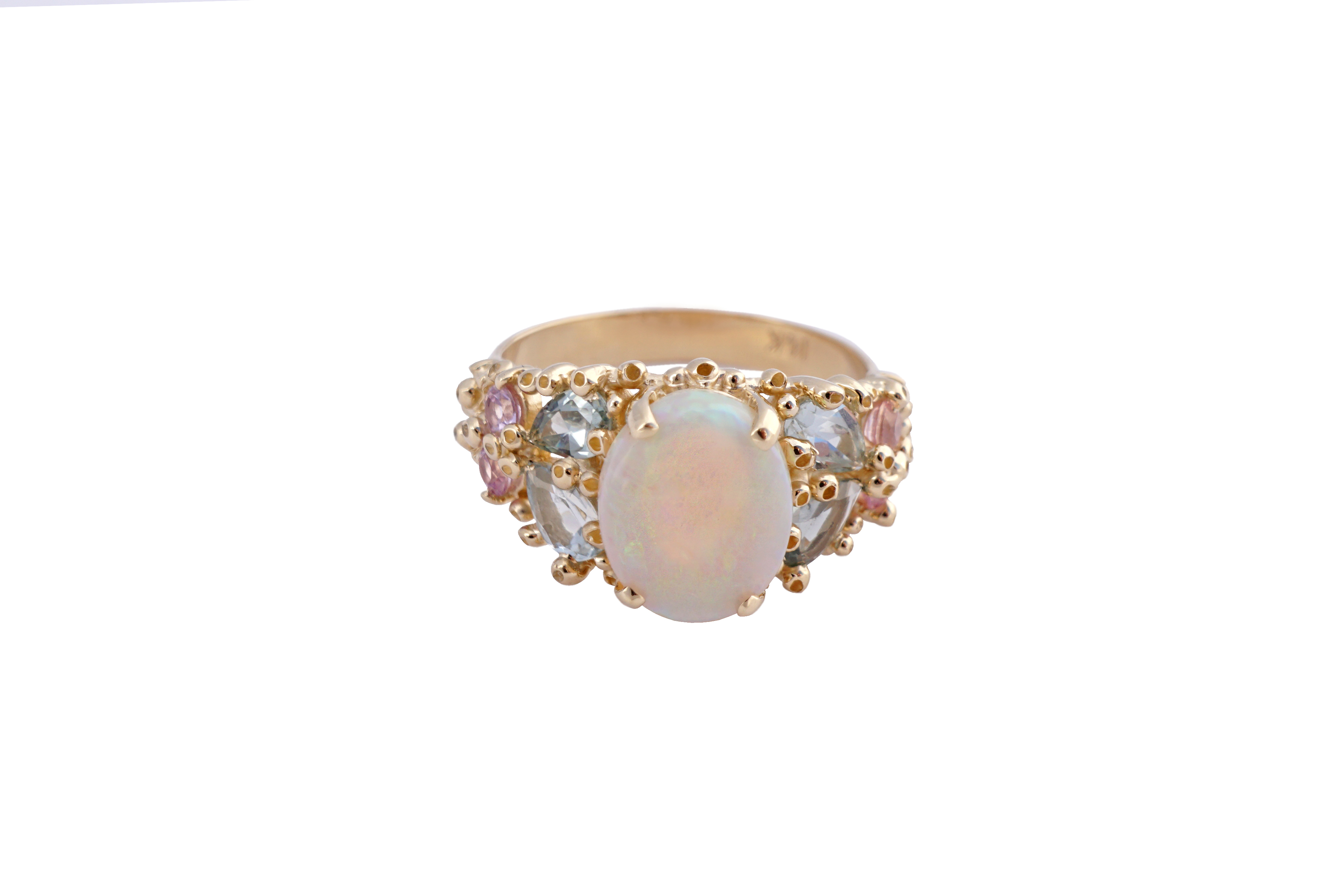 Sweet Thing Ring with opal, light blue pear shape sapphires, and round violet sapphires in 14k gold, $2,500; Ruta Reifen