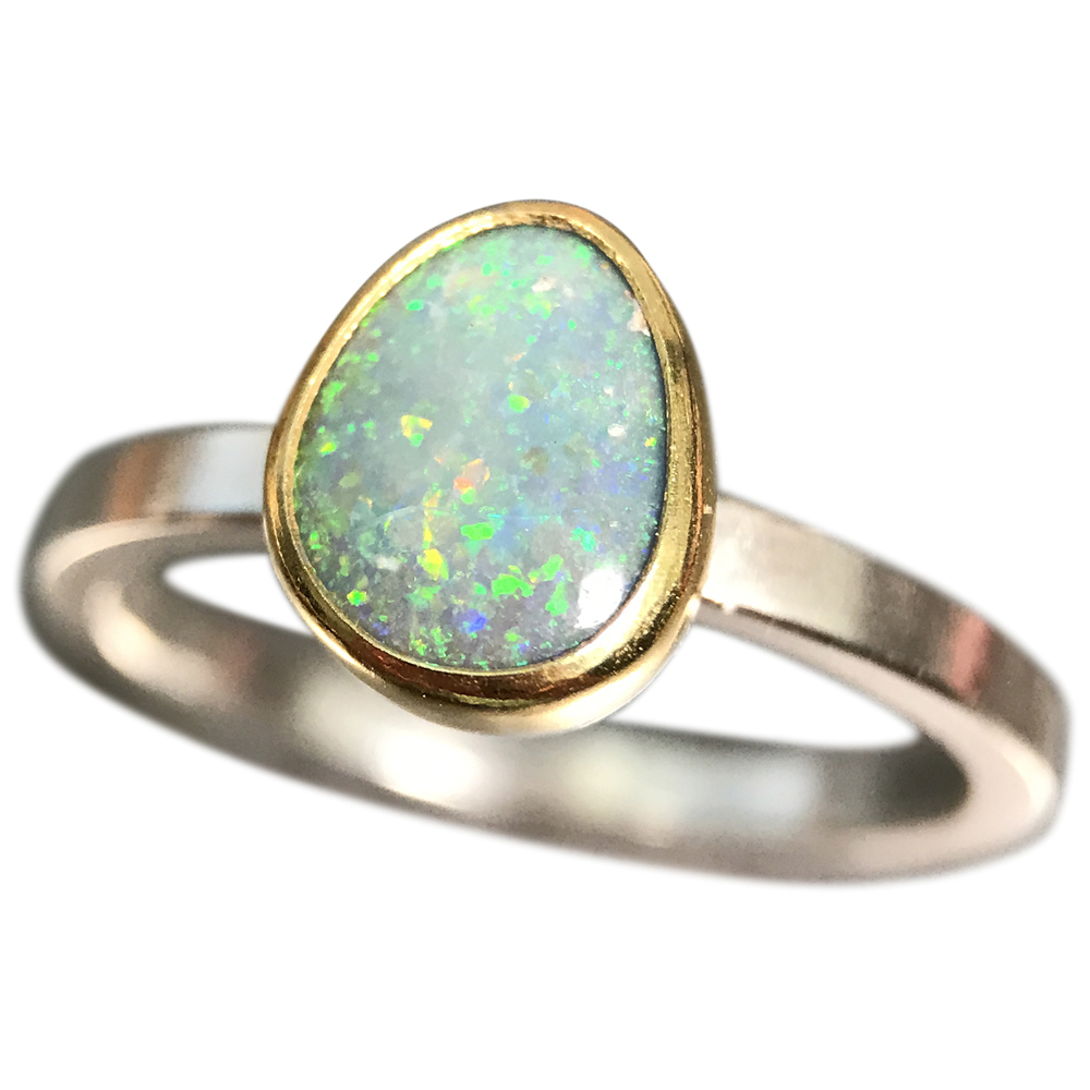 (Top: Ring with custom-carved opal in 22k gold and silver, $2,600; By Jodi)