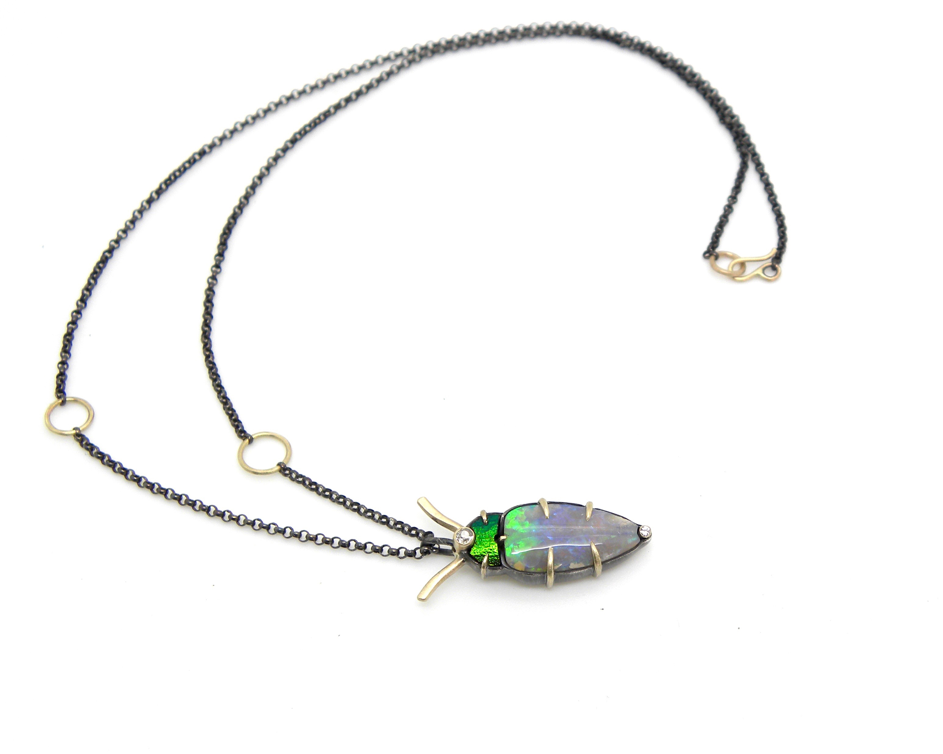 Beetle Pendant with opal and genuine beetle wing on an oxidized silver chain with 14k gold accents, $1,430; Hannah Blount