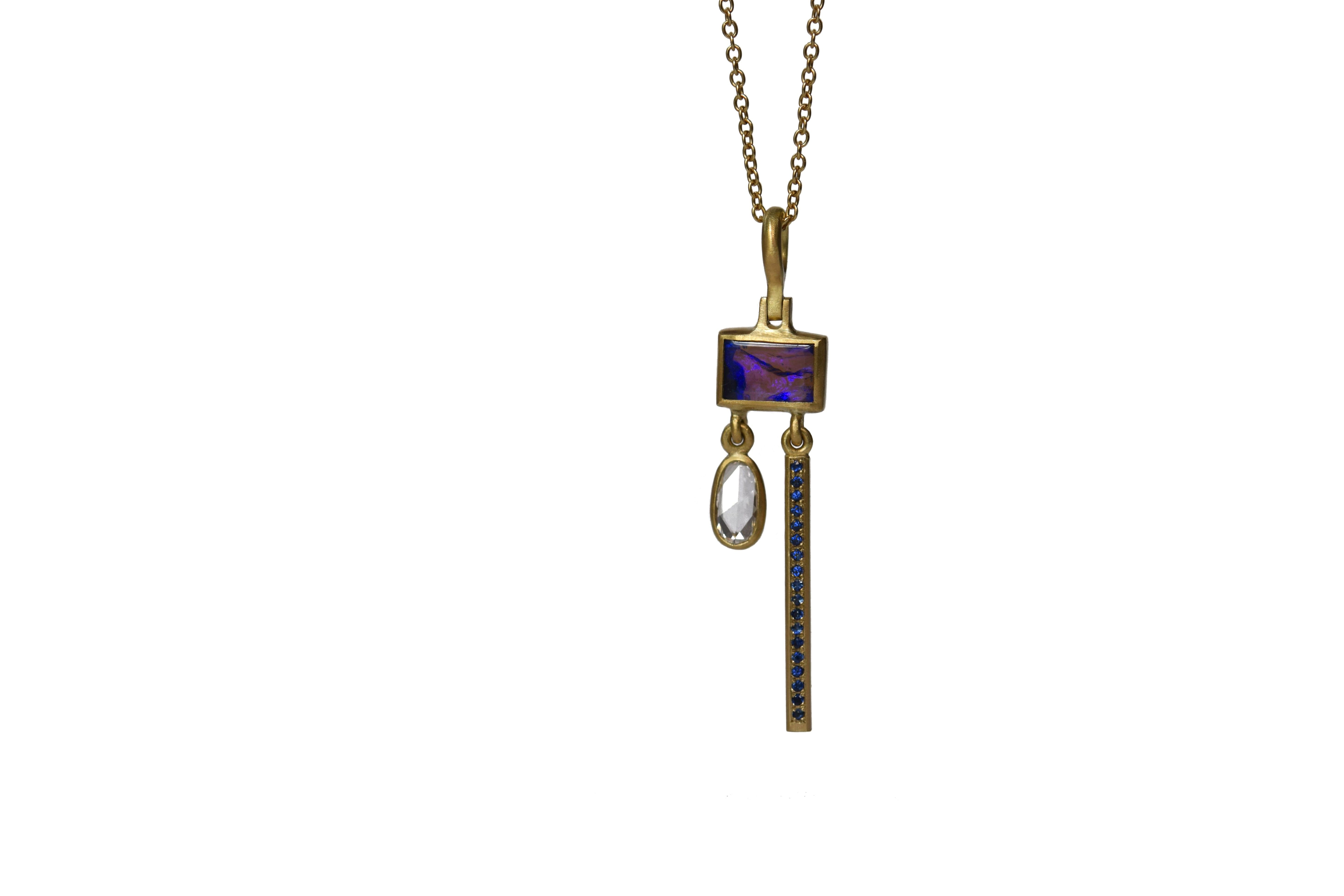 Asymmetrical necklace with rectangular opal, blue sapphires, and rose-cut diamond in 18k gold, $2,500; Yamane Studio