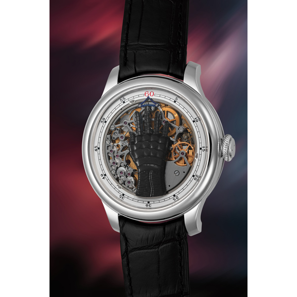 F.P. Journe’s FFC model (pictured at top) eschews traditional hands in favor of a five-fingered automaton to indicate the hours—a mechanism developed by Journe based on a concept Coppola pitched during a dinner at his Napa Valley winery. This is the original platinum prototype for the watch (which was recently released in its final production version), engraved with Coppola’s and Journe’s names on the back and featuring the human-hand-shaped automaton in blackened titatnium.