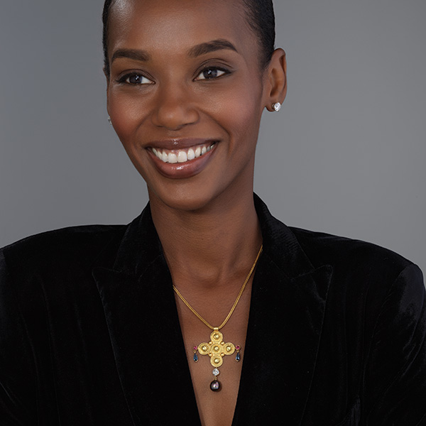 Top: Rebecca Rau’s Cross of the Byzantine (price on request) features a high-karat gold cross circa A.D. 700–1000, accented with an 0.97 ct. old-mine diamond, 0.86 ct. t.w. pear-shape color-change garnets, 0.48 ct. t.w. round pink tourmalines, and an iridescent Tahitian black pearl, on an 18k yellow gold Italian foxtail chain (photos courtesy of Rebecca Rau Jewels)