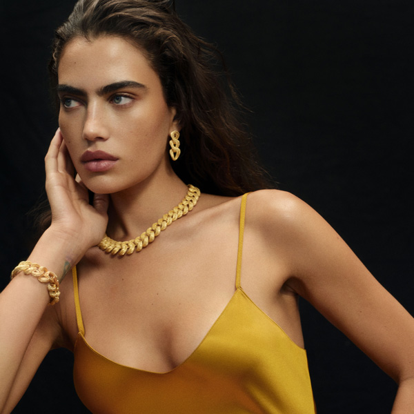 Top: Rosa earrings, necklace, and bracelet in 18k gold–plated brass, $128–$348; Reformation