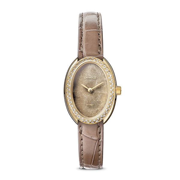 This is Shinola’s first oval-shape watch, and the Book Tower’s impressive third-floor skylight served as its inspiration, Little says. The atrium is considered an architectural feat of glass- and ironwork, something that is reflected in the Book watch’s halo of diamond bezel and polished Petoskey stone dial.