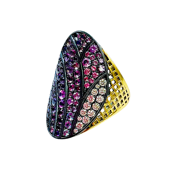 Perennial favorite Ray Griffiths is returning to Melee with quite a few new pieces, including the ring below. “I wanted to capture the fleeting beauty of the flutter of a butterfly wing,” the designer tells JCK. “I was watching a video clip and became obsessed with the intricate structure of a butterfly’s wing. The intricate milgrain edging that traces the oxidized silver is like nature’s own veining.”