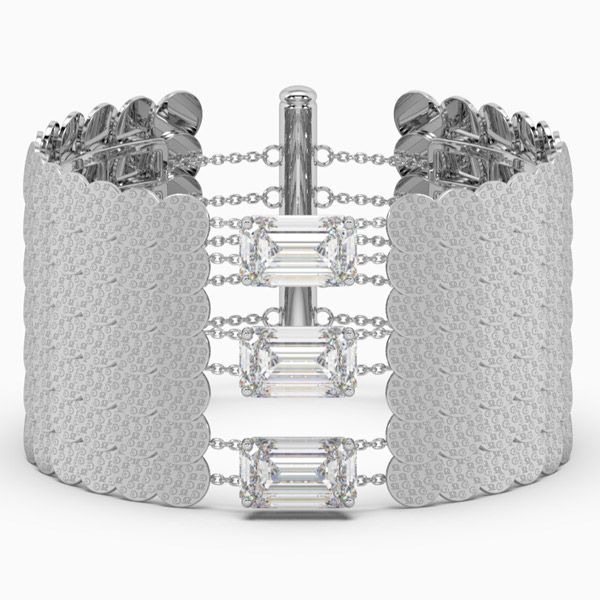 Contemporary silhouettes abound: a ring that runs the length of the finger, with two bands beneath a row of overlapping coin-shape plates; a scalloped choker-style necklace connected with thin chains, one of which suspends a large diamond; cornucopia-shaped earrings with feathery circular layers that climb up the ear; and a wide bracelet with three rows of floating emerald-cut diamonds (pictured at top).