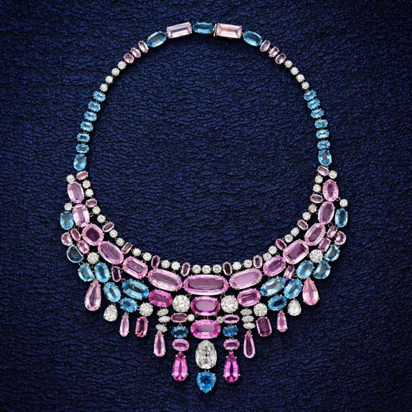 Top: Suzanne Belperron necklace with pink topaz, morganite, aquamarine, and diamonds, estimate $250,000–$350,000 (photos courtesy of Sotheby’s)