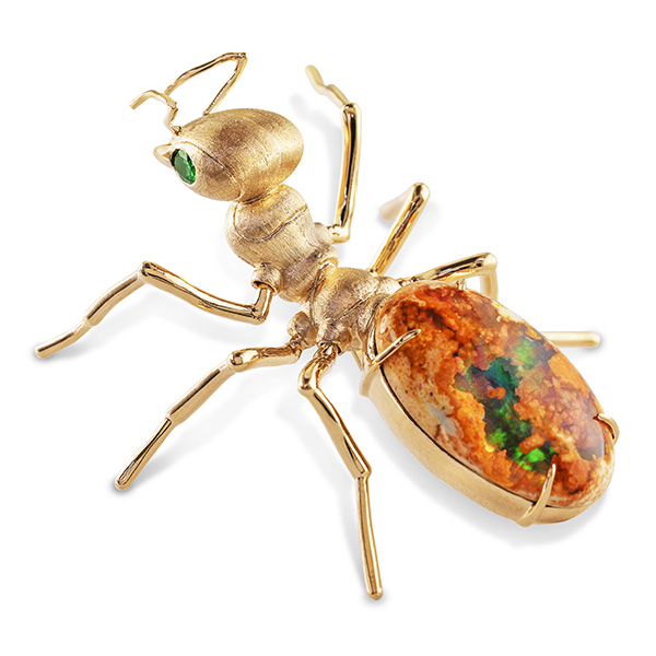 Top: Ant lapel pin in 14k gold with Mexican fire opal, $6,545; Parlé