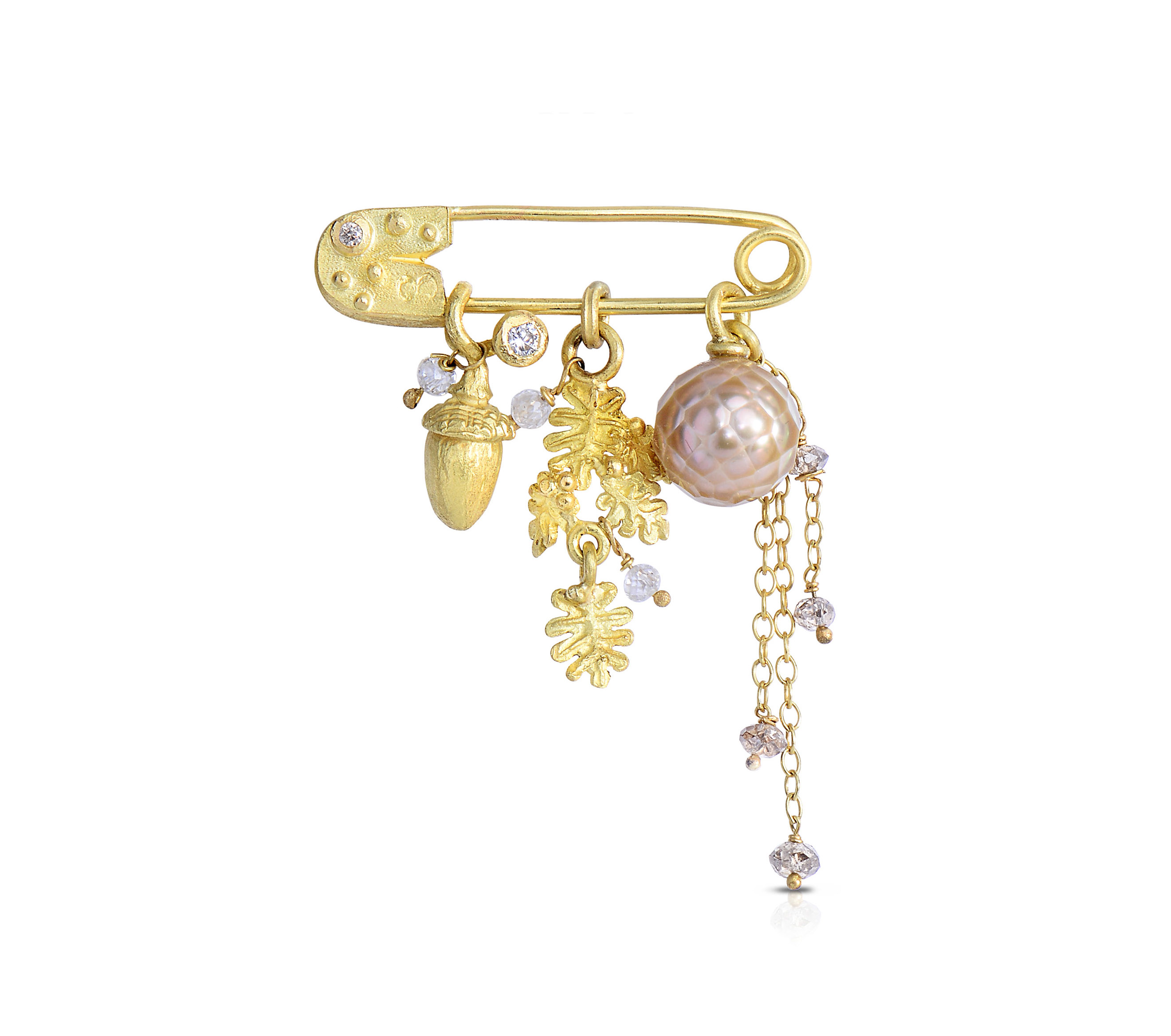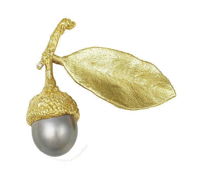Acorn Brooch in with gray Tahitian pearl with a diamond-accented 19.2k yellow gold cap and 18k green gold leaf, $4,260; Aaron Henry Designs