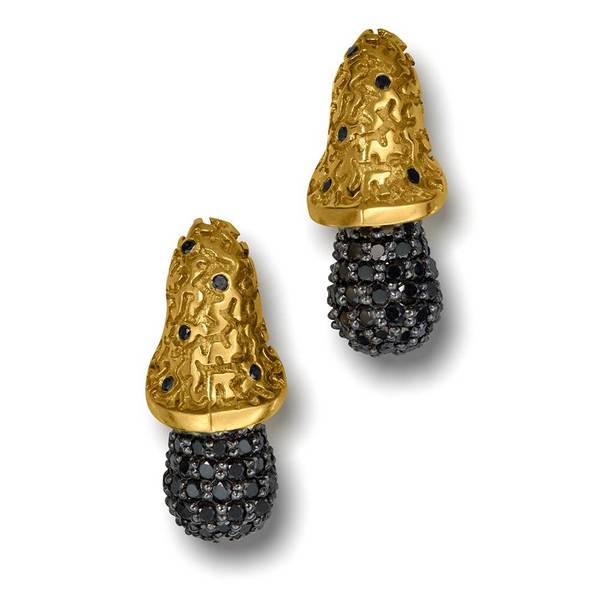 Acorn Earrings with black diamonds in 18k yellow gold, $4,900; Alex Soldier