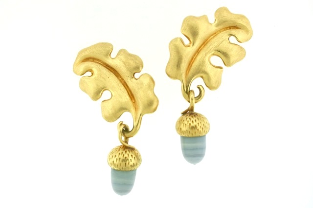 I’ve spent a good part of the fall foraging for jewels that feature acorns, always delighted when one turns up at a trade show, a press preview, or the “forests” of the internet. With its smooth and prickly textures, an acorn naturally lends itself to sculptural metalwork, although Aaron Henry cleverly cast the nut as a Tahitian pearl; the masterful Joel Arthur Rosenthal (aka JAR) chose banded agate.