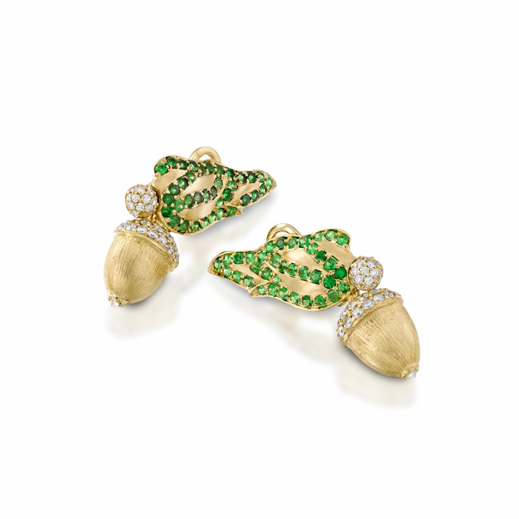 Acorn and Oak Leaf Earrings with tsavorites and diamonds in 18k yellow gold, $5,950 AUD ($4,540 USD); Reigne Jewellery