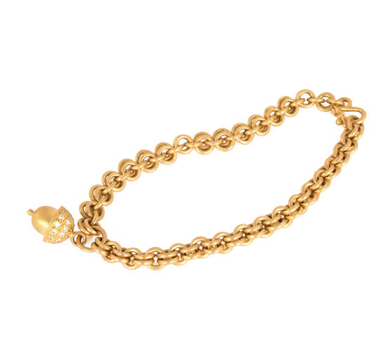 Pre-Raphaelite Bracelet with diamond-accented acorn in 20k peach gold, price on request; Reinstein Ross