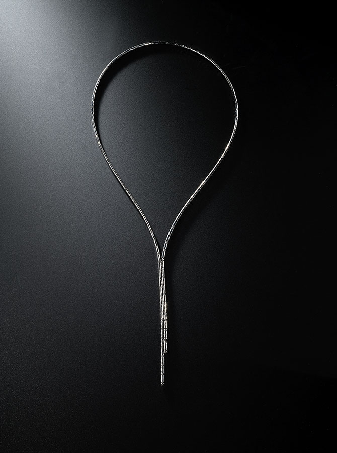 (Top: Sliding Ornament Station Necklace with brilliant-cut sliding balls in platinum $1,350)