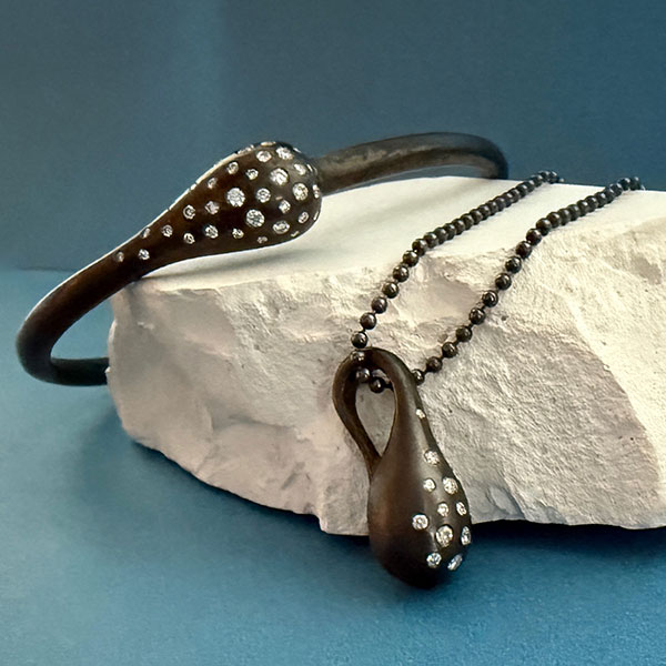 Top: At Melee the Show this weekend, SunLit Fine Jewelry is set to debut the Ocean Droplets collection, which includes the Supreme bangle ($2,750) with 36 white ocean diamonds and the Supreme Droplet Medallion ($1,850) with 16 white ocean diamonds, both in blackened sterling silver. (Photos courtesy of SunLit Fine Jewelry)