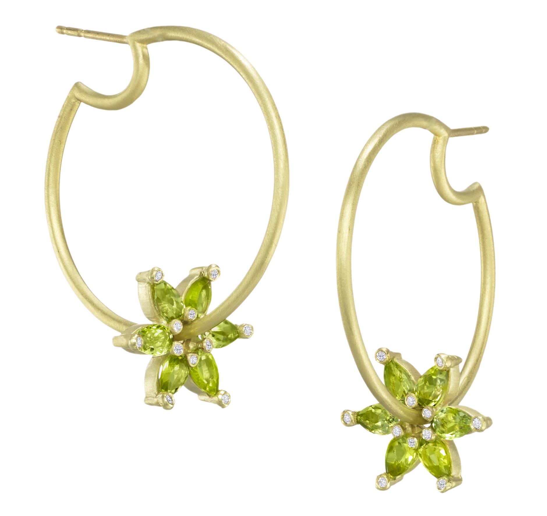 Spinning gemstone hoop earrings in 18k yellow gold with peridot and diamonds, price on request; Suzy Landa