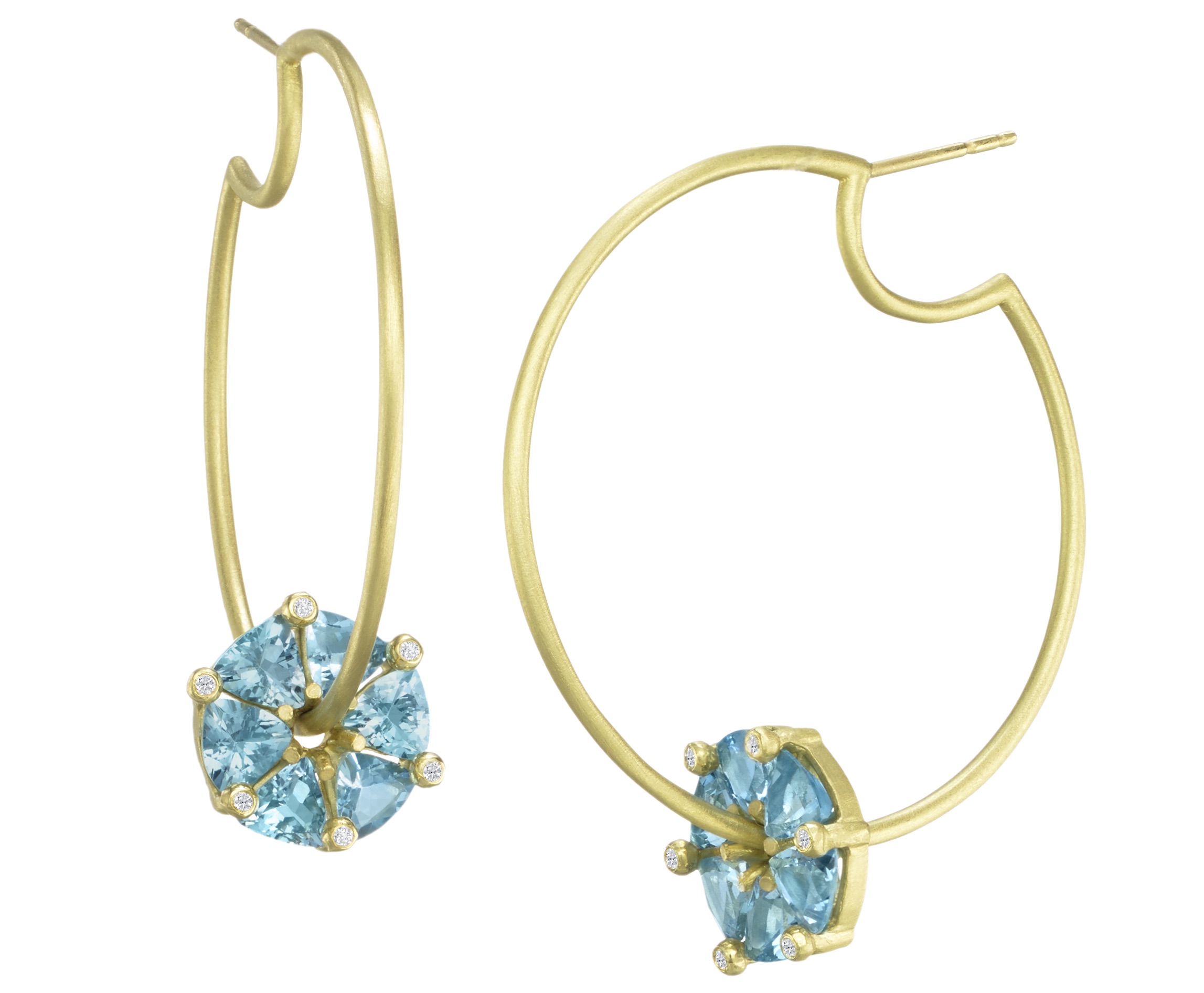 Spinning gemstone hoop earrings in 18k yellow gold with aquamarine and diamonds, price on request; Suzy Landa