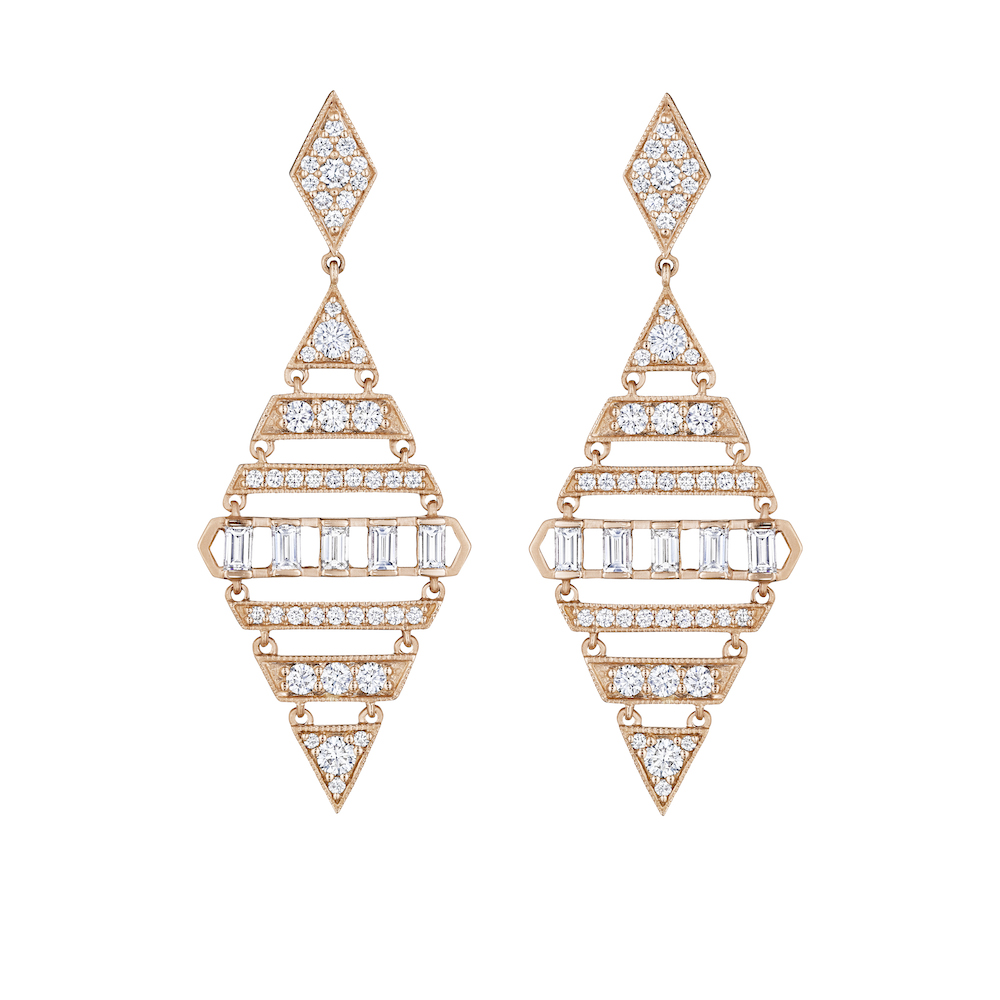 Moderne Large Diamond Shape Deco EarringsModerne Large Diamond Shape Deco Earrings with baguettes in 18k rose gold