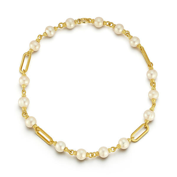 Top: Large rectangular link & 17-inch pearl necklace in 18k gold, $19,800; Tanya Farah