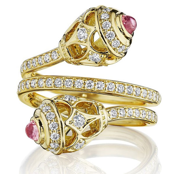 But jewelry comes in all shapes and sizes, and takes inspiration from the world over. Some of the pieces pictured here speak to the means of travel—depicting an airplane, an anchor, a compass. Others zero in on something associated with a certain destination, such as a palm tree or a croissant. Others still are more abstract, created as an ode to a specific place: Verragio’s collection influenced by sacred places in Asia; Noora Shawqi’s pieces related to Japan; and Harwell Godfrey honoring Egypt through its important symbol, the fly.