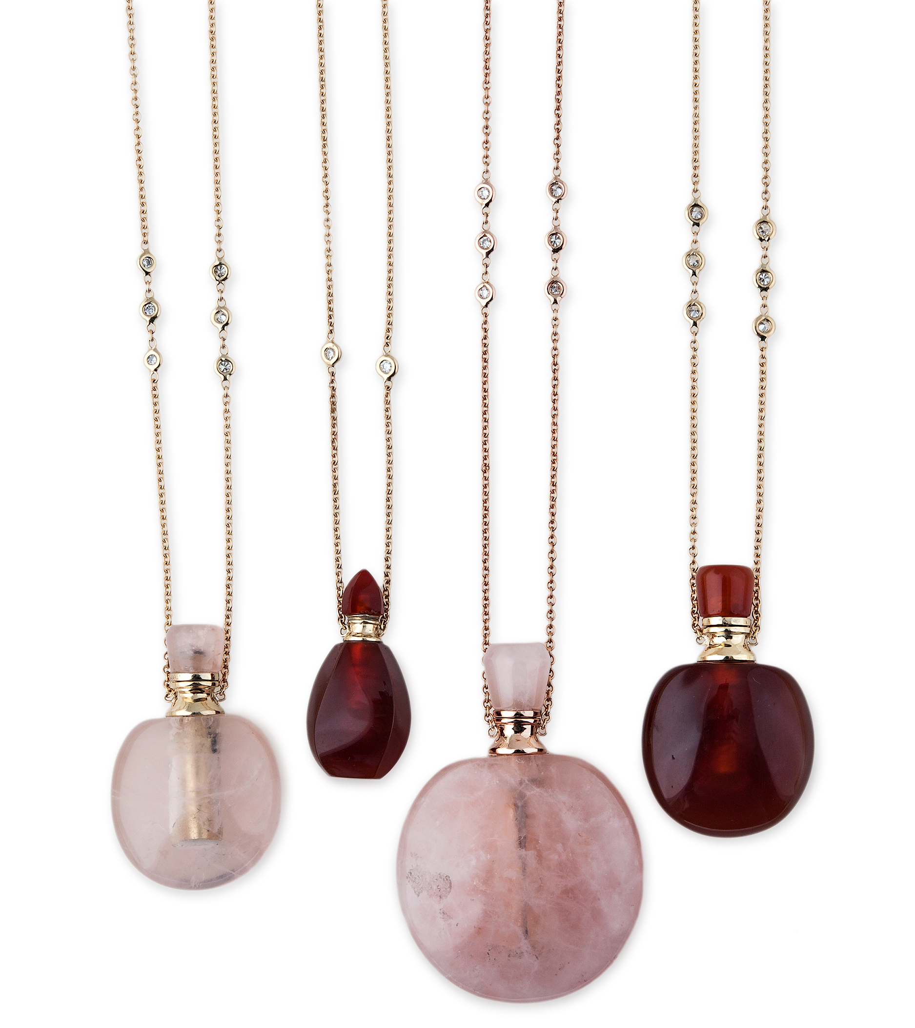 Potion Bottles in 14k rose and yellow gold with rose quartz, carnelian, and diamonds, prices on request