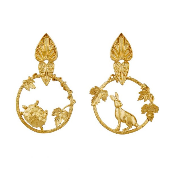 With inspiration from Aesop’s fables, pieces like the earrings featuring the tortoise and the hare are featured in the Fables collection by U.K.-based Alex Monroe. “Passed down over centuries of storytelling, Fables sees Alex and our design team craft a world of folklore and morality inspired by the age-old wisdom of Aesop. In Fables, every treasure has a tale to tell and a lesson to be learned,” read the notes on the collection.