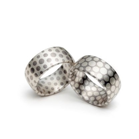 The Montreal-based Christine Dwane’s Cross the T’s and Dot the I’s collection features bands in sterling silver with contrasting patterns. “When I first thought of these rings, I was thinking they would be interesting wedding bands,” says the designer’s notes on the collection. “The fact that they are paired by design but with opposite colors of metals for each pair made me think of couples. The contrasting properties of the metals reminded me of the contrasts in character and the contrasting roles each person has in a couple.”