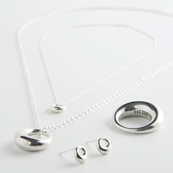 The Aura Silver collection from Minrl features heavy rounded shapes in pendants, earrings, and a ring. “The smooth finish, the round shape, the symmetry, proportions, and weight that characterize this collection calls on this superior force that we would like to protect us, bring us good health, well-being, order, and stability in moments of uncertainty,” read notes on the collection.