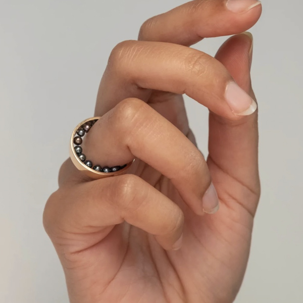Parisian jeweler JEM’s Étreintes Chapter III comprises rings with architectural lines, negative space, gemstone inlay, and pearls. “Architecturally inspired, the harmonious lines featured in the collection remain pure, capturing the strength of simplicity and the beauty of form. Enigmatic and playful, the curves both puzzle and entice,” reads a note on the collection.
