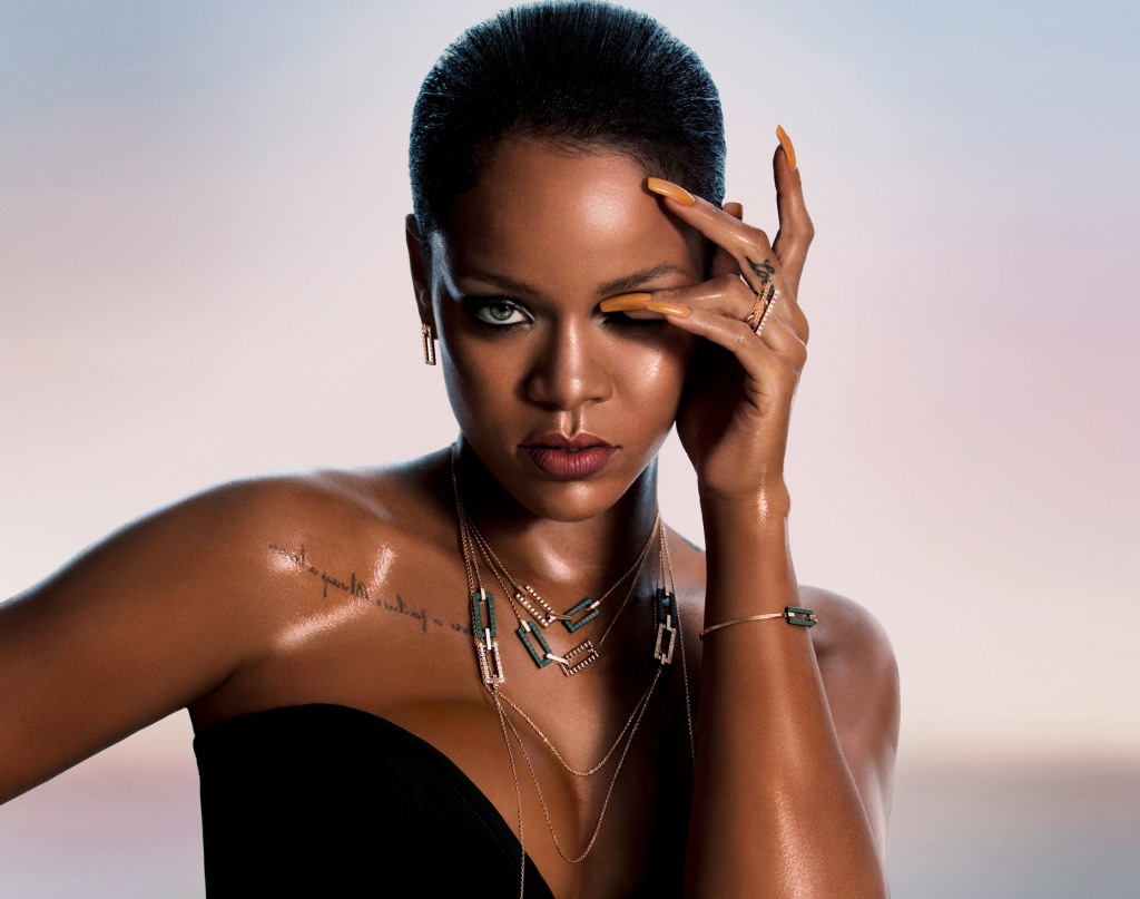 Singer/CFDA icon/fashionista Rihanna already has an apparel, footwear, and accessories line (Fenty Puma by Rihanna); it was only a matter of time before she moved into jewelry. Not surprisingly, she turned to one of her red-carpet faves to do it: Rihanna Chopard debuted in April as a nine-piece capsule collection of cube-filled geometric styles in the brand’s Fairmined rose gold with ceramic accents in Jungle Green (Rihanna picked the trendy shade). Fittingly, there’s also haute joaillerie, which RiRi previewed on the Grammys red carpet in February. Next, may we suggest Rihanna Jacquie Aiche body chains?