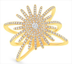 Kate collection starburst ring with 0.58 ct. t.w. pavé-set diamond rays in 14k yellow gold; $1,490; Shy Creation; 213-623-8900; shycreation.com