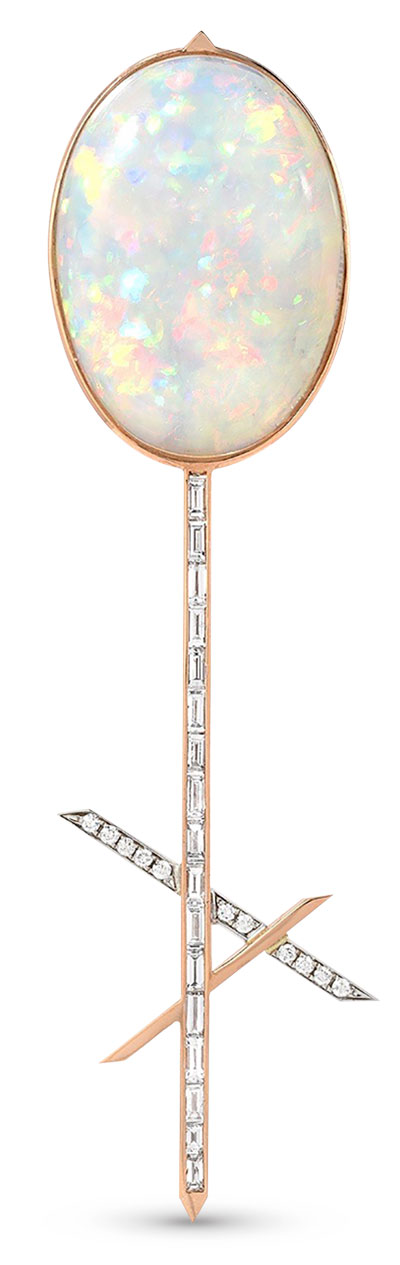 Top: X earrings with 3.1 cts. t.w. baguette and pavé diamonds in 14k yellow and white gold, $16,200, Line earrings with 0.5 ct. t.w. baguette and pavé diamonds in 14k yellow and white gold, $3,800; left: Single Opal X earring in 18k white and rose gold with a 17.62 ct. opal and 1.23 cts. t.w. baguette and pavé diamonds, $14,400; Emily P. Wheeler; 646-745-6831; emilypwheeler.com
