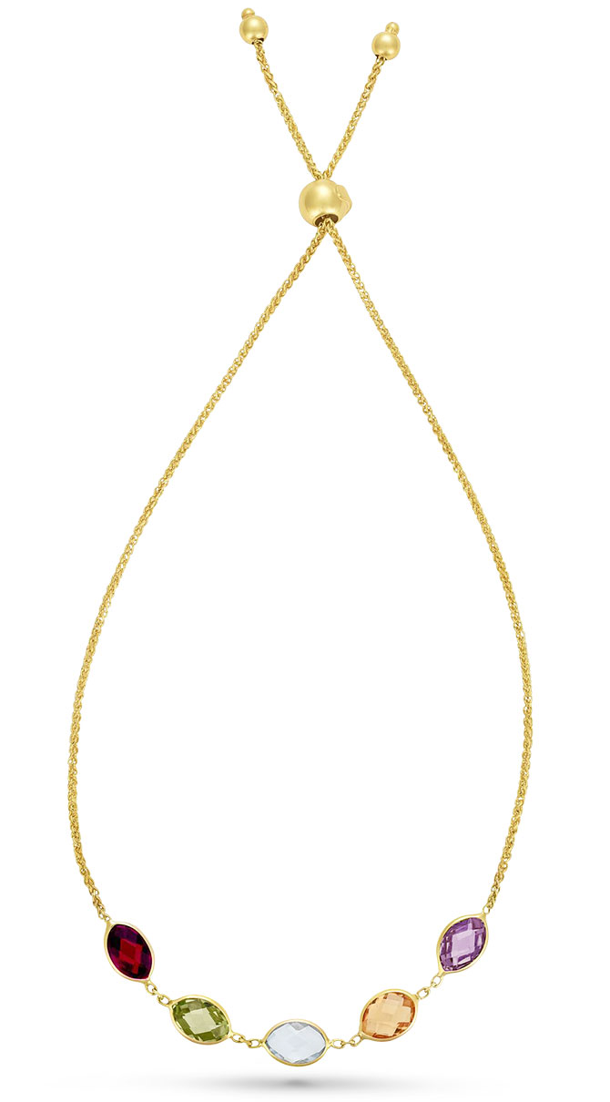 Choker necklace in 14k yellow gold, $605; bracelet in 14k yellow gold with garnet, peridot, blue topaz, citrine, and amethyst, $370; bead link drop earrings in 14k gold, $305 (sold as pair); Royal Chain Group; sales@royalchain.com; royalchain.com