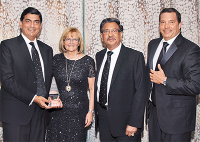 At its Oct. 14 dinner-dance and gala, the Jewelers 24 Karat Club of Southern California honored Avi Raz of A&Z Pearls and the Bhindi family of Bhindi Jewelers with its Excellence in Service Award. (Pictured here are Dhanesh and Vinod Bhindi, far l. and third from l., with 24 Karat president Karen Signorino and Rolex’s Cliff Cook.) Douglas K. Hucker, CEO of the American Gem Trade Association, received the Lifetime Achievement Award.