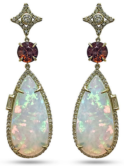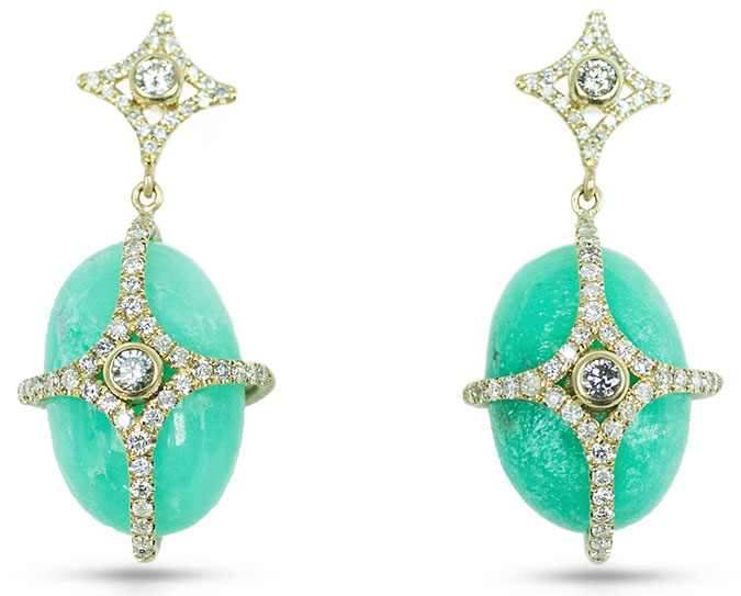 Jewelry from top: Jordan Alexander one-of-a-kind 18k gold Ce Soir earrings with African opals, zircons, and diamonds; 18k gold and pavé diamond Caged chrysoprase earrings