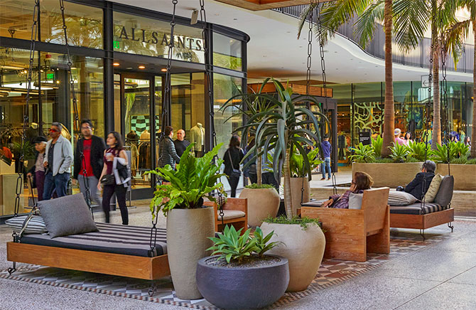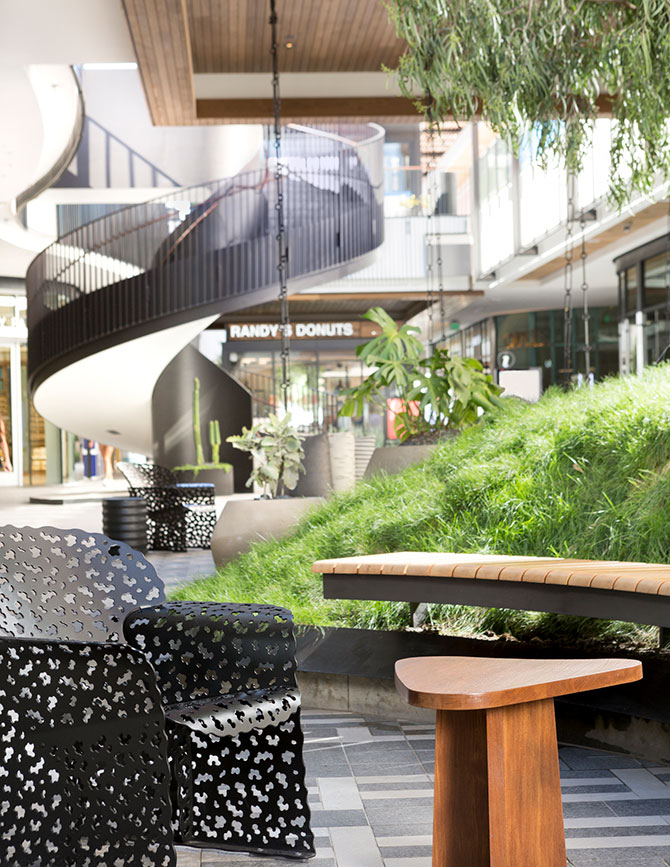The unique space is largely the work of renowned designer Kelly Wearstler, who collaborated with OJB Landscape Architecture and Westfield’s design team. Wearstler, whom The New Yorker called “the presiding grande dame of West Coast interior design,” had never worked on a mall before, which she considered a plus in this revamp.