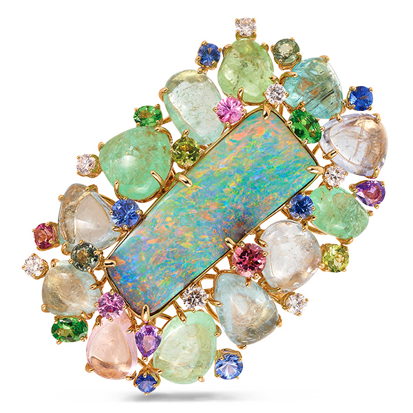 Centered with a 26.69 ct. Australian opal, the 18k yellow gold ring features 58.52 cts. t.w. paraiba tourmaline; 1.77 cts. t.w. diamonds; 1.74 cts. t.w. blue, 0.57 ct. t.w. pink, 0.67 ct. t.w. purple, and 0.89 ct. t.w. green sapphires; 0.91 ct. t.w. tsavorite; 0.7 ct. t.w. peridot; and 0.8 ct. t.w. pink tourmaline.