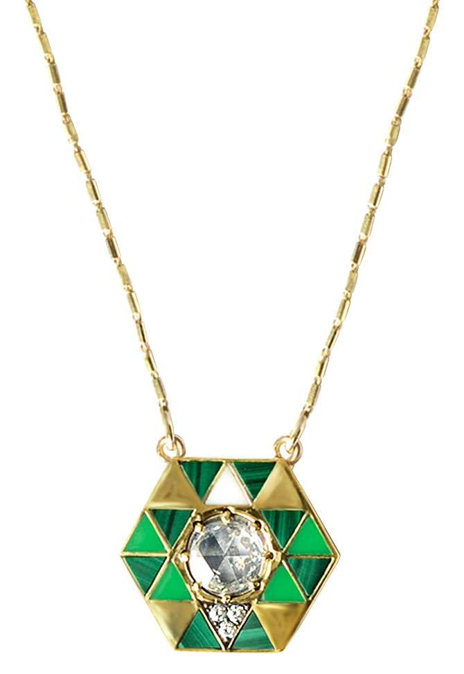 Mata pendant in malachite, white onyx, enamel, quartz, and diamonds in 18k yellow gold; $3,995; Harwell Godfrey; 646-745-6831; harwellgodfrey.com