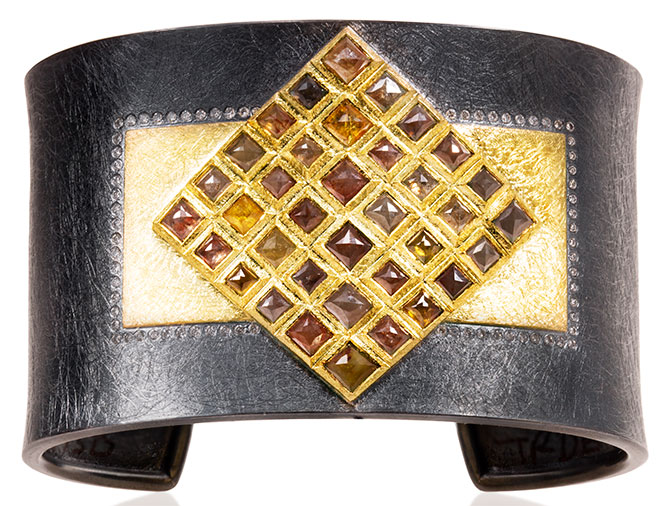 Cuff with a mosaic of multicolored fancy diamonds and white diamonds in 18k yellow gold and sterling silver; $43,750; Todd Reed; 303-442-6280; toddreed.com
