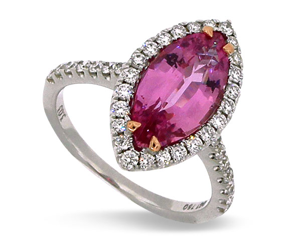 Ring with 3.08 ct. pink sapphire and diamonds in 18k gold; $22,500; Dilamani; 800-342-6677; dilamani.com