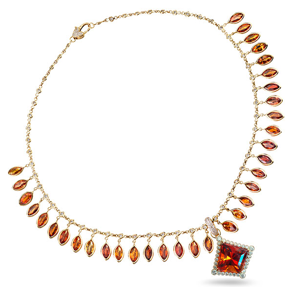 Featherette 18k yellow gold necklace with 30.32 cts. t.w. orange sapphires and 1.81 cts. t.w. diamonds, $26,400, 18k yellow gold Nova pendant with 16.54 ct. citrine and 0.74 ct. t.w. diamonds, $13,200; Erica Courtney; 323-938-2373; ericacourtney.com