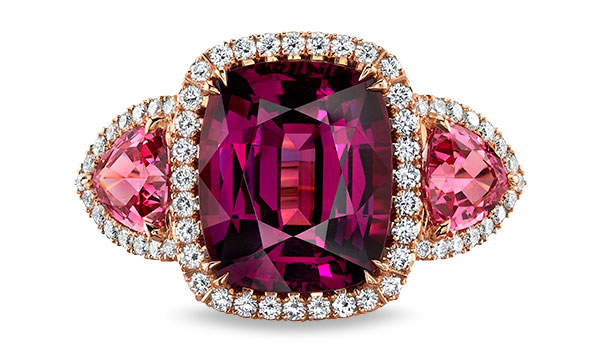 18k rose gold ring with 4.45 ct. purple garnet, 1.28 cts. t.w. pink spinel, and 0.42 ct. t.w. diamonds; $17,400; Omi Privé; 626-331-4533; omiprive.com
