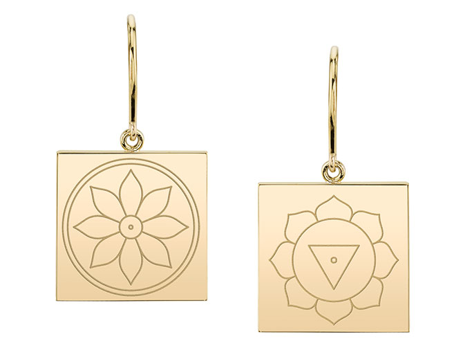 Mismatched engraved earrings in 18k yellow gold; $3,045; ARK; 646-745-6831; arkfinejewelry.com