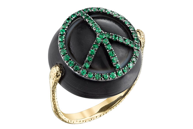Peace ring with agate and green garnet in 18k yellow gold; $3,380; Borgioni; 310-849-9050; borgionis.com