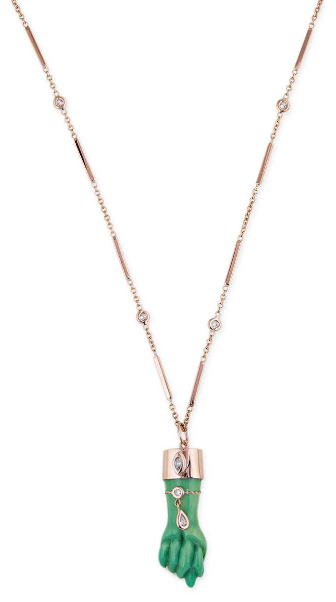 Figa necklace in 14k rose gold with resin and diamonds; $5,250; Jacquie Aiche; 310-550-7529; jacquieaiche.com