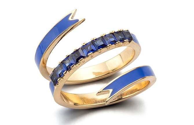 Ribbon ring in 14k gold with enamel and blue sapphires; $2,730; Nora Kogan; lauren@megamegaprojects.com; norakogan.com