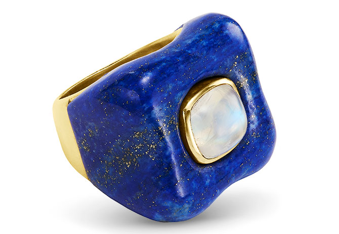 Draper ring in 18k yellow gold with moonstone and lapis; $6,750; Rush Jewelry Design; 212-219-3793; rushjewelrydesign.com