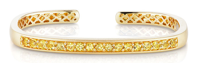 Cirque hinged cuff bracelet with yellow beryl in 14k yellow gold; $3,465; Jane Taylor Jewelry; 413-687-3153; janetaylor.com