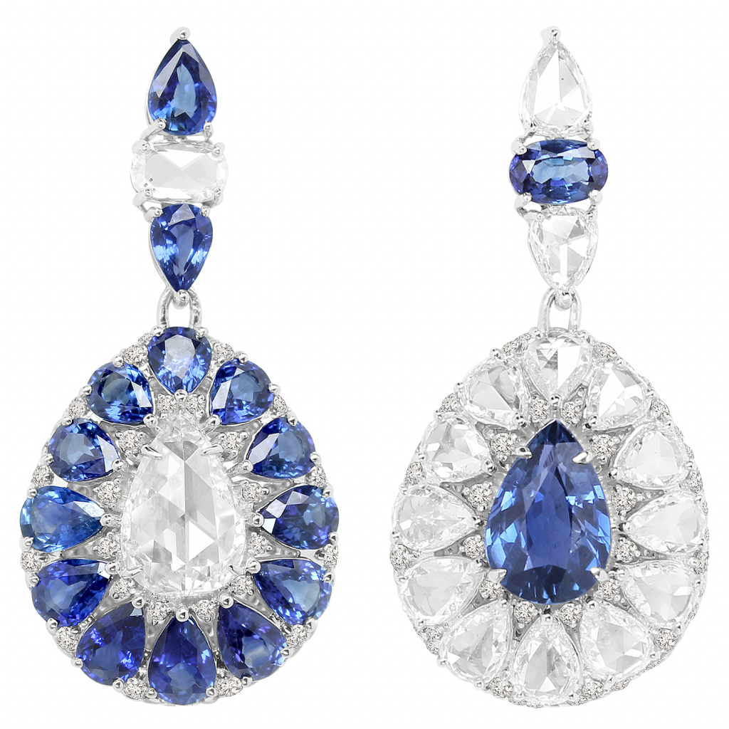Earrings in 18k gold with 10.5 cts. t.w. sapphires and 9.5 cts. t.w. rose- and round-cut diamonds; price on request; Sutra; 713-984-4987; sutrajewels.com