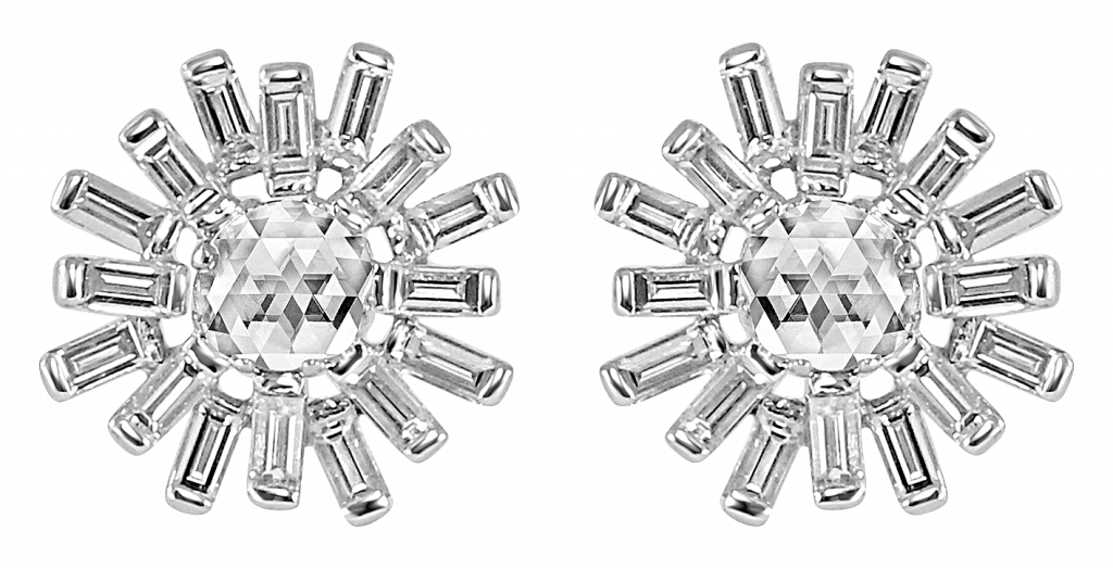 Sunburst earrings in 18k white gold with 1.64 cts. t.w. rose-cut and baguette diamonds; $5,600; Vivaan; 212-302-3130; vivaan.us